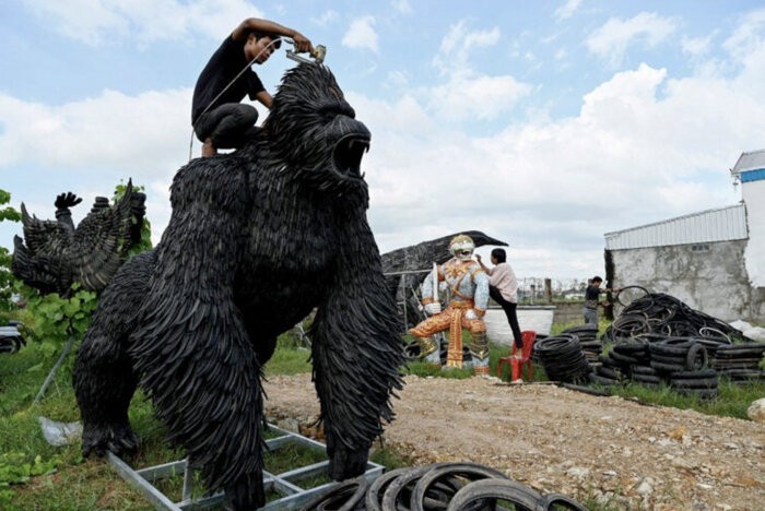 Художник Мин Титфип уже много лет повторно использует выброшенные шины от велосипедов и мототехники. Результат этой своеобразной вторичной переработки поражает воображение в особо крупных масштабах. Почти 5 лет Камбоджиец превращает старую резину в масштабные скульптуры и статуи.